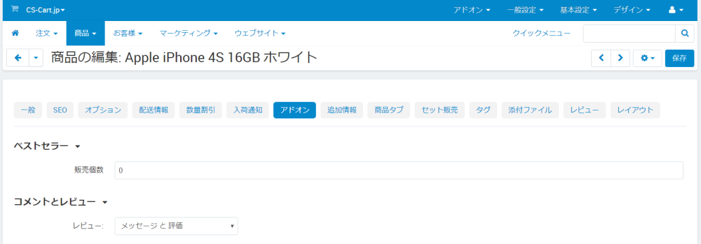 商品詳細の「アドオン」タブからベストセラーの算出に使用する販売個数を手動で調整できます。