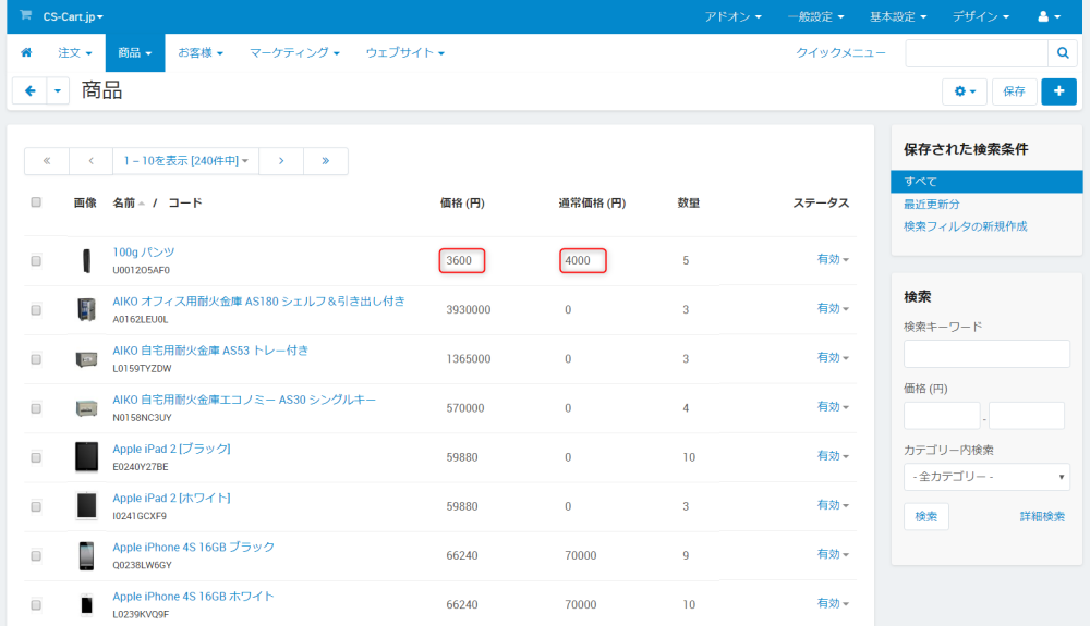 ベストセラーは商品詳細の「アドオン」タブから販売個数を手動で調整できます。セール中商品は商品の価格(セール価格)と通常価格を設定することで、割引率が自動計算され表示されます。