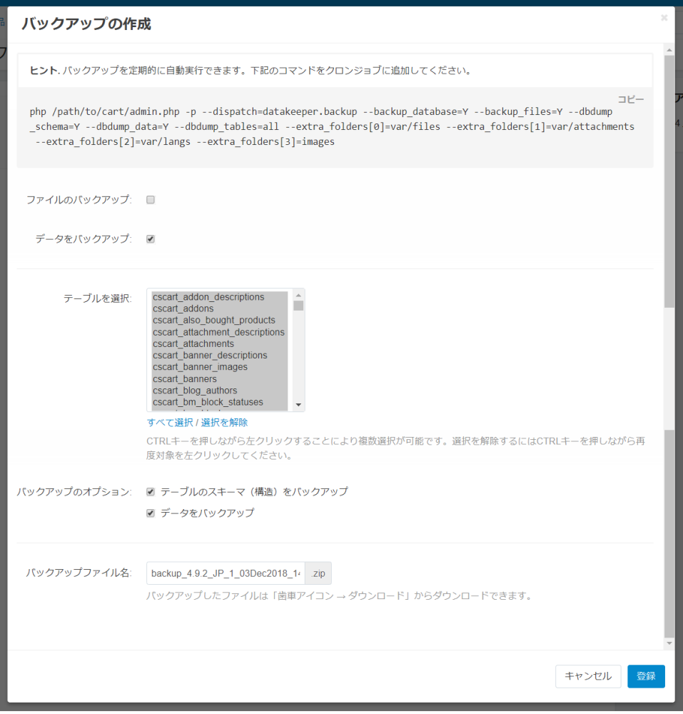 | バックアップファイル名 | バックアップのファイル名を指定してください。 拡張子は.zipというファイルとなります。 |