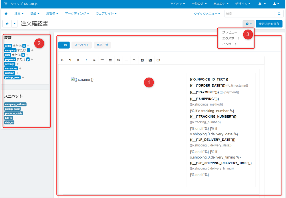 | スニペット | スニペットのリストが表示されます。またスニペットを編集、追加できます。 |
