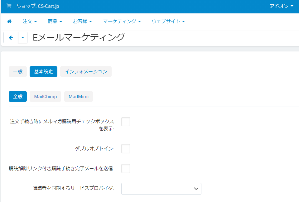管理画面の アドオン → アドオンの管理 にアクセスし、「Eメールマーケティング」アドオンの名前をクリックして設定画面を開きます。