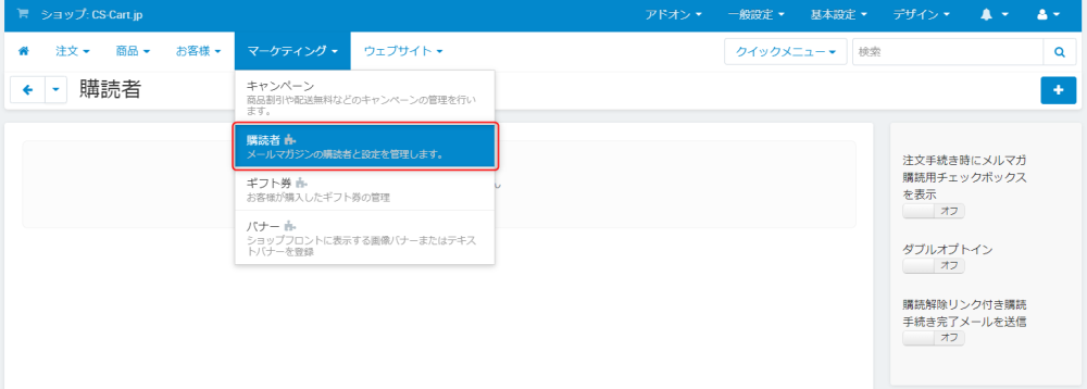 | ダブルオプトイン | チェックするとメルマガ購読申請時にお客様に購読確認のメールを送信します。 |