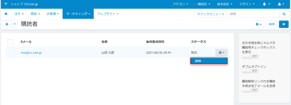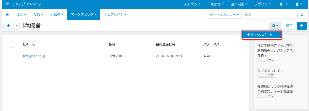 管理画面の マーケティング → 購読者 からメルマガの購読者を管理できます。