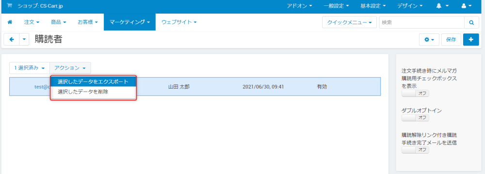 購読者を選択して、アクションメニューから「選択したデータをエクスポート」、「選択したデータを削除」の操作をすることができます。