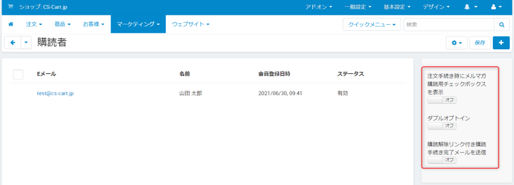 | ダブルオプトイン | ONにするとメルマガ購読申請時にお客様に購読確認のメールを送信します。 |