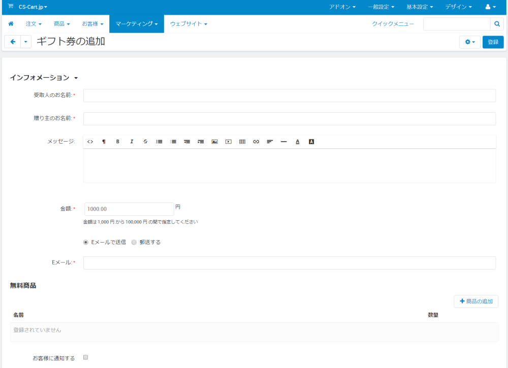ギフト券は、 マーケティング → ギフト券 から追加できます。