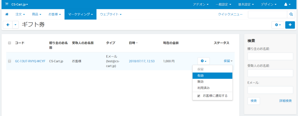 発行したギフト券はステータスを『有効』にすることでお客様に通知されます(Eメールを選択時)