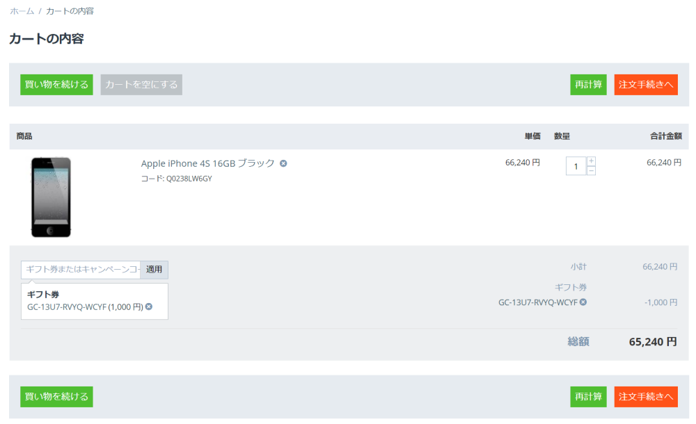 「カートの内容」ページまたはご注文手続き画面の「注文の概要」でギフト券コードを入力することにより、ギフト券を利用することができます。