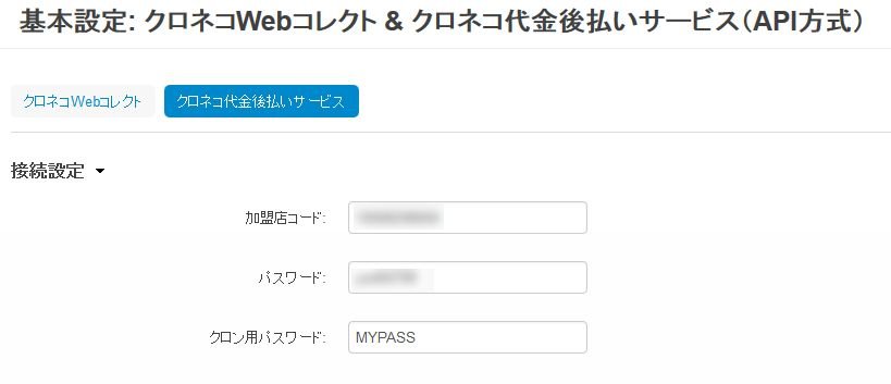 アドオンのインストールが完了したら、 アドオン → アドオンの管理 → クロネコWebコレクト & クロネコ代金後払いサービス(API方式) にアクセスし、基本設定タブにおいて以下の項目を設定してください。