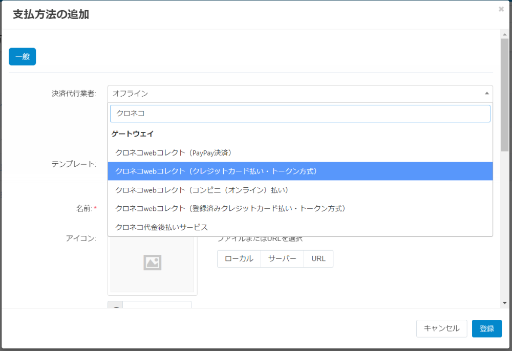 支払方法の登録時に、「一般」タブの「決済代行業者」フィールドに