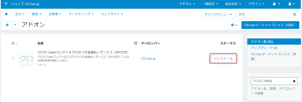 アドオン → アドオンの管理 にアクセスし、クロネコWebコレクト & クロネコ代金後払いサービス(API方式) をインストールします。