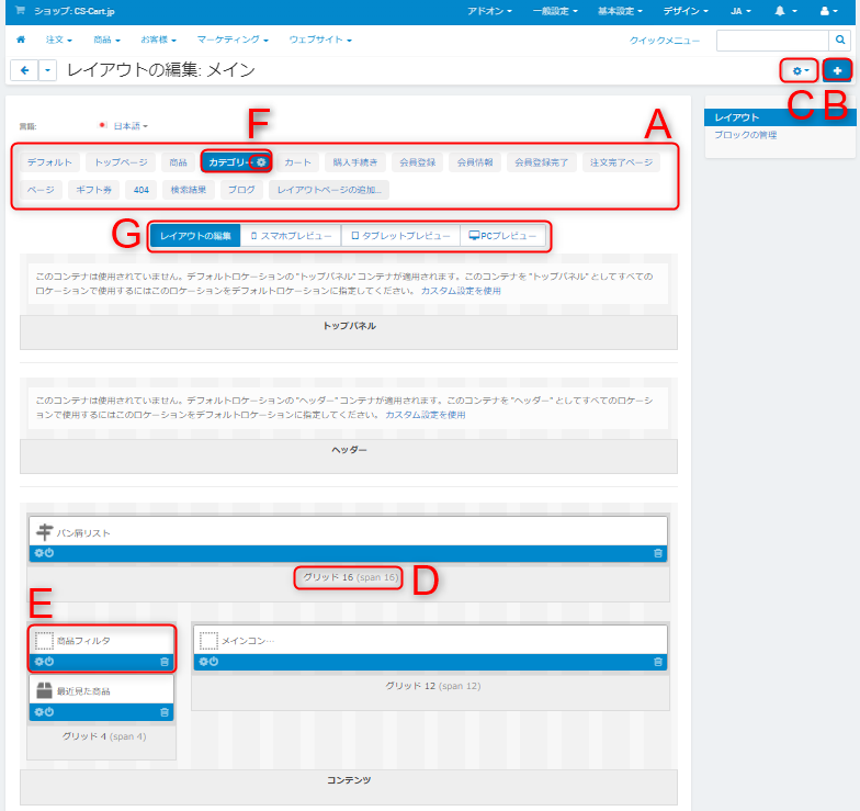 | E | ブロック グリッドに格納する要素です。これらを配置してロケーションごとにページを構築していきます。 |