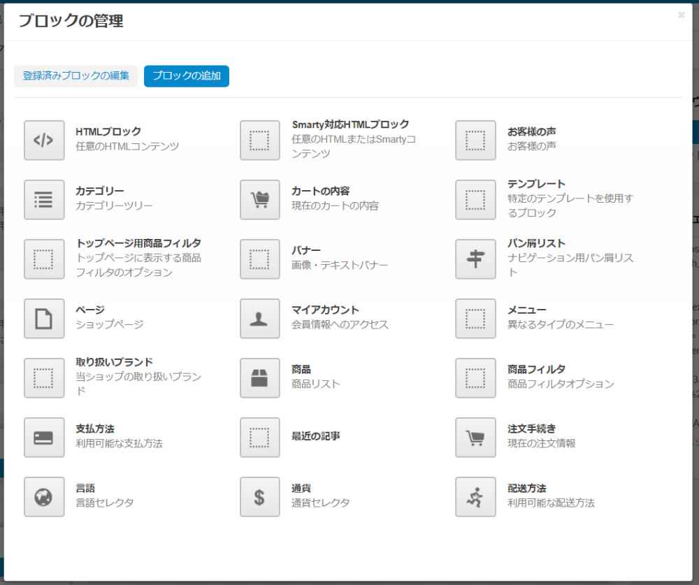 ブロックの管理画面では登録済みブロックの編集、ブロックの追加ができます。