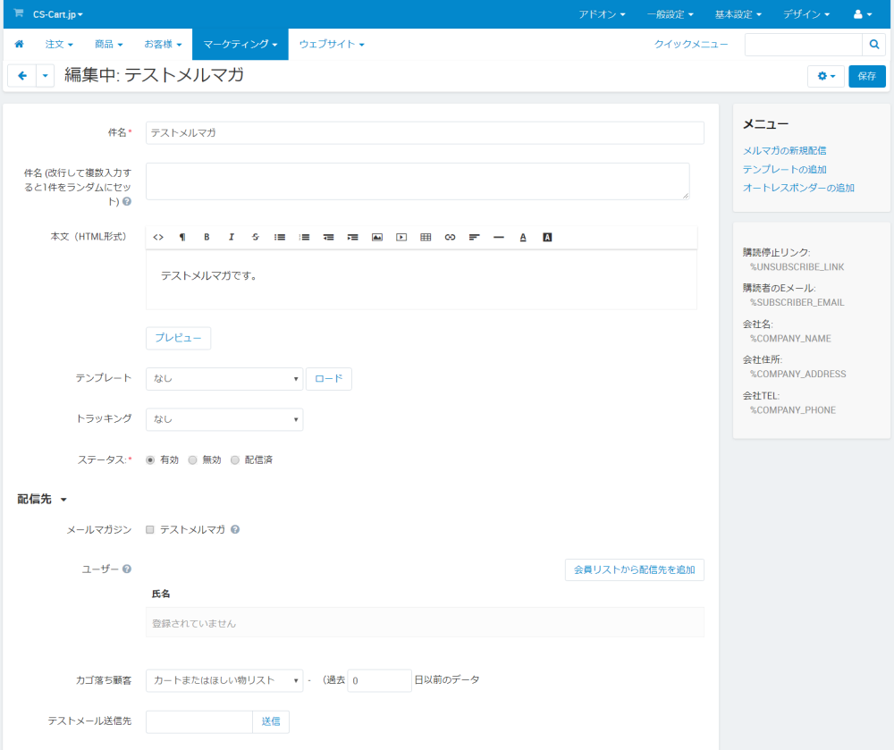 マーケティング → メルマガ配信 → メルマガ配信 → 各メルマガ名 から、メールマガジンタイトルや購読者の設定を行います。
