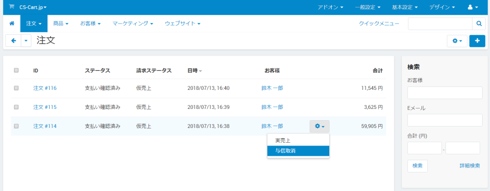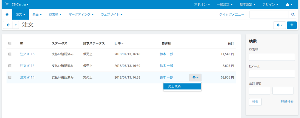注文 → クレジット請求管理 にアクセスし、売上を取り消したい注文にカーソルを合わせると表示される歯車アイコンをクリックし、さらに 売上取消 をクリックすることにより売上取消処理を実行できます。