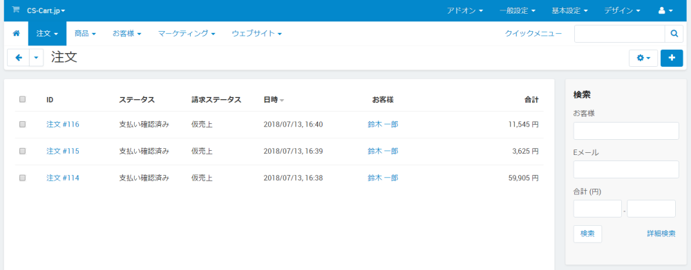 注文 → クレジット請求管理 にアクセスすることにより、omise(カード決済)を利用した注文の取引状況を確認できます。