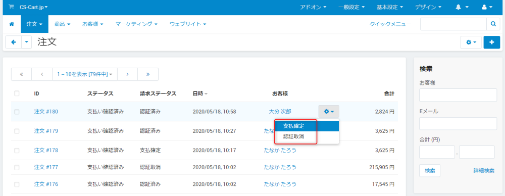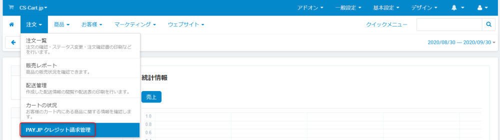 管理画面において 注文 → PAY.JPクレジット請求管理 を選択すると、クレジットカード決済の注文一覧画面が表示されます。