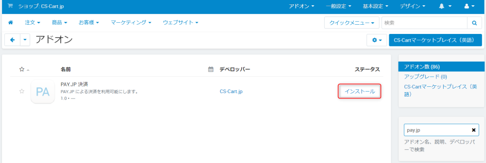 アドオン → アドオンの管理 にアクセスし、 PAY.JP 決済 をインストールします。