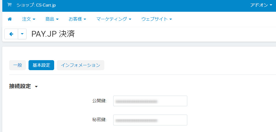 アドオンのインストールが完了したら、 アドオン → アドオンの管理 → PAY.JP 決済 にアクセスし、基本設定タブにおいて以下の項目を設定してください。