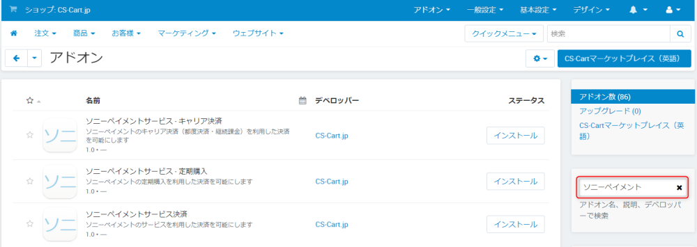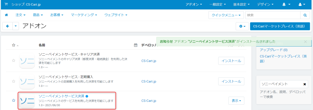アドオン → アドオンの管理 にアクセスし、「検索」テキストボックスに ソニーペイメント と入力します。