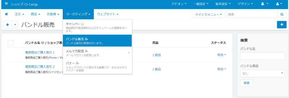 - マーケティング → バンドル販売 ページでバンドル販売を追加できます。このページには、すべてのバンドル販売の一覧が表示され、下記の操作が可能です。