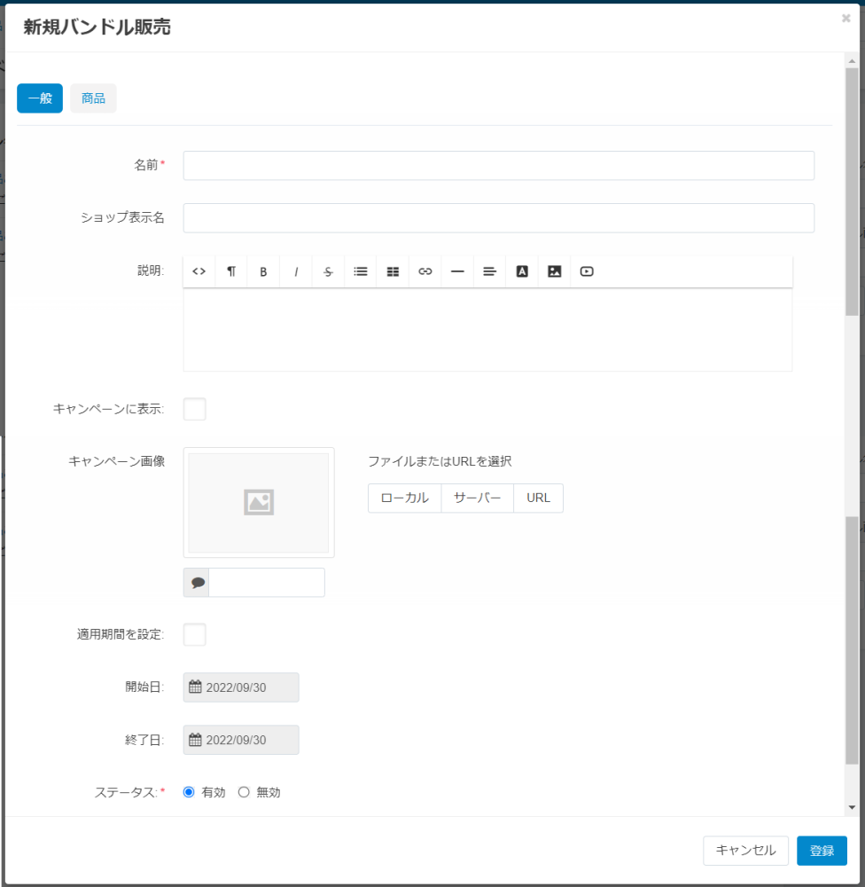 | バンドル商品 | 商品を検索して追加します。 (マーケットプレイス版の場合一般タブで選択した出品酒の商品のみが表示されます。) |