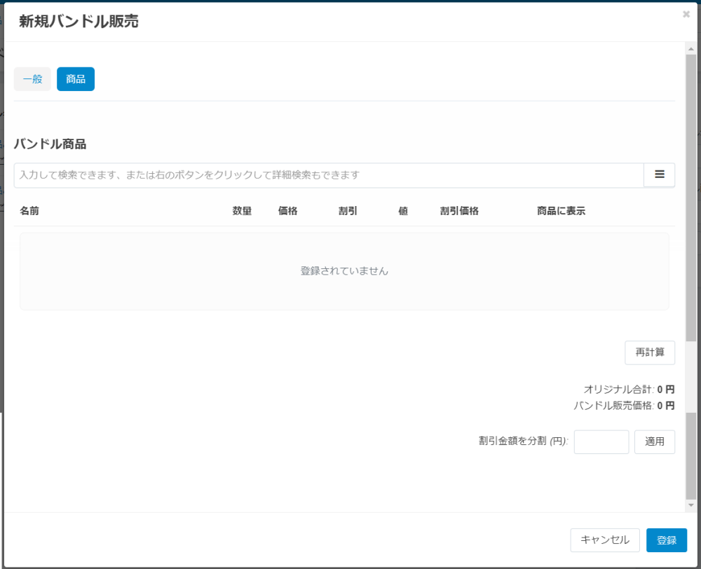 | 割引金額を分割 (円) | テキストボックスに全体の割引金額(円)を入力し、「適用」ボタンをクリックすると、商品のオリジナル価格割合を基に「割引価格」と「バンドル販売価格」を再計算します。 |