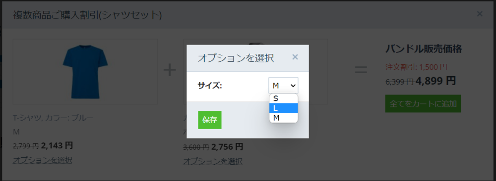 - バンドル販売に商品バリエーションがある場合、お客様が「バリエーション(1商品内に設定)」で目的のバリエーションを選択できるようにするか、単一の商品バリエーションでバンドル販売を作成できます。