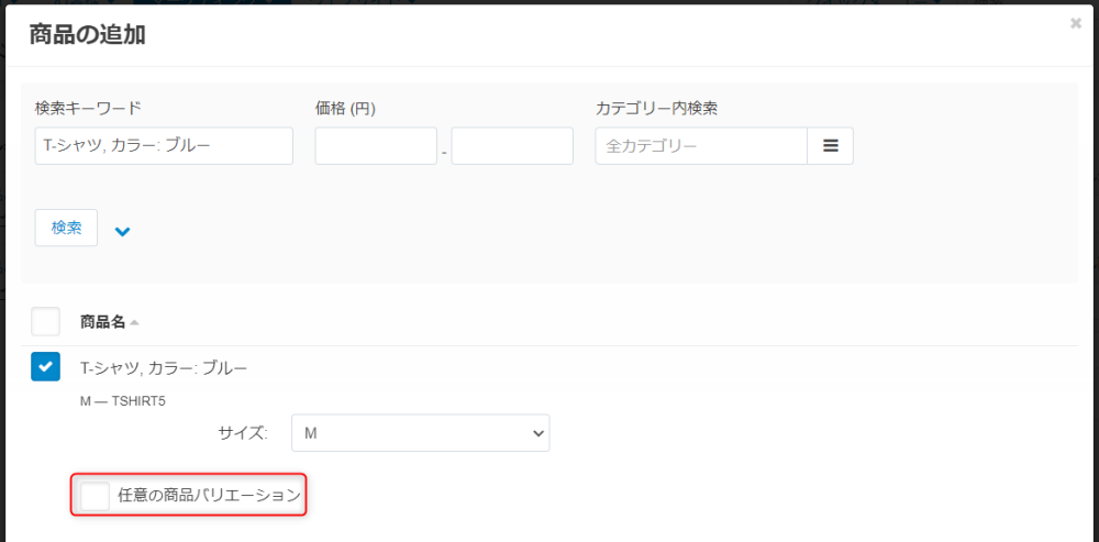 - バリエーションを指定する場合は、「任意の商品バリエーション」のチェックを外します。