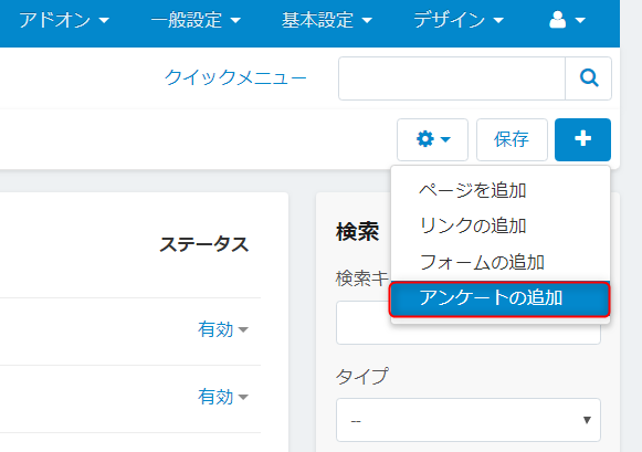 ウェブサイト → ページ の新規追加メニュー(+マークアイコン)をクリックし、「アンケートの追加」を選択します。