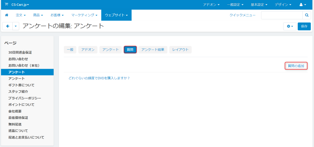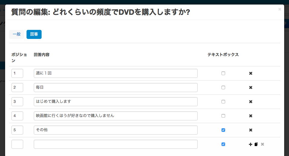 「質問」タブの「質問の追加」ボタンをクリックすると質問する項目を追加できます。