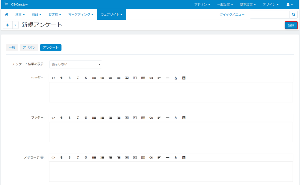 「アンケート」タブではアンケート結果の表示方法の選択、ヘッダーやフッター、アンケート回答後に表示されるメッセージを設定します。