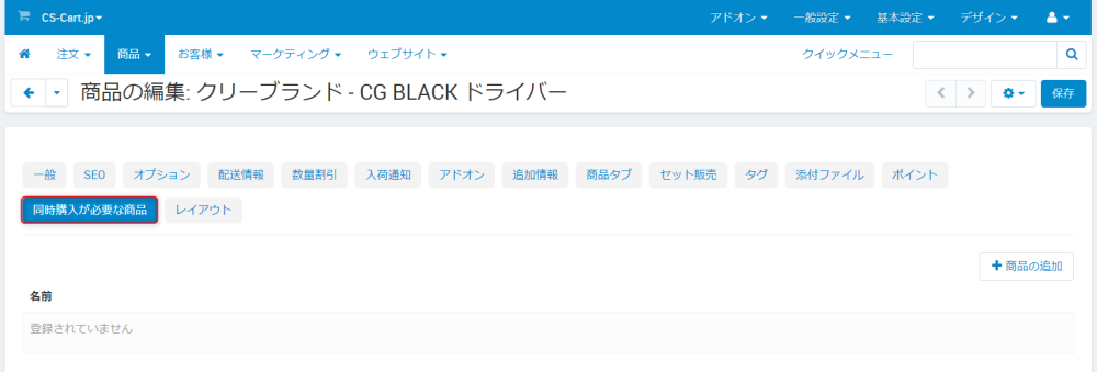 商品詳細編集ページにおいて、「同時購入が必要な商品」タブを選択し、この商品と同時購入が必要な他の商品を選択します。