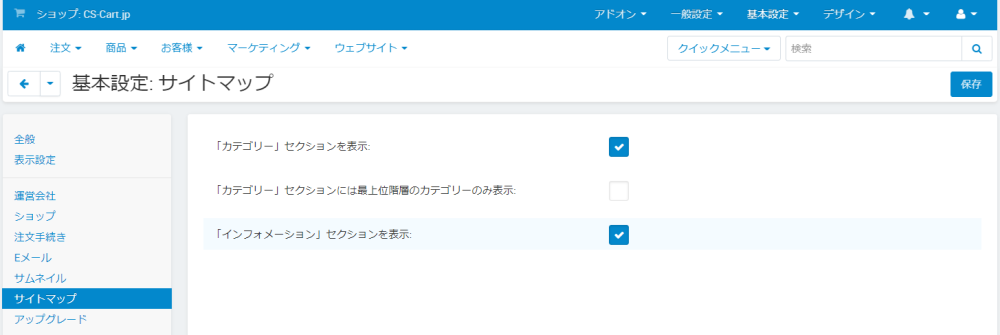| 「カテゴリー」セクションを表示 | チェックボックスをオンにすると、CS.Cartが自動生成するサイトマップに「カテゴリー」を表示します。 |
