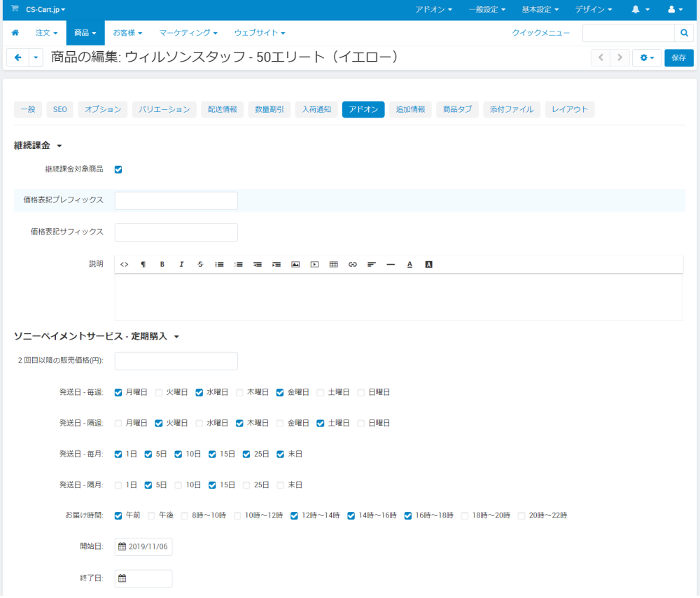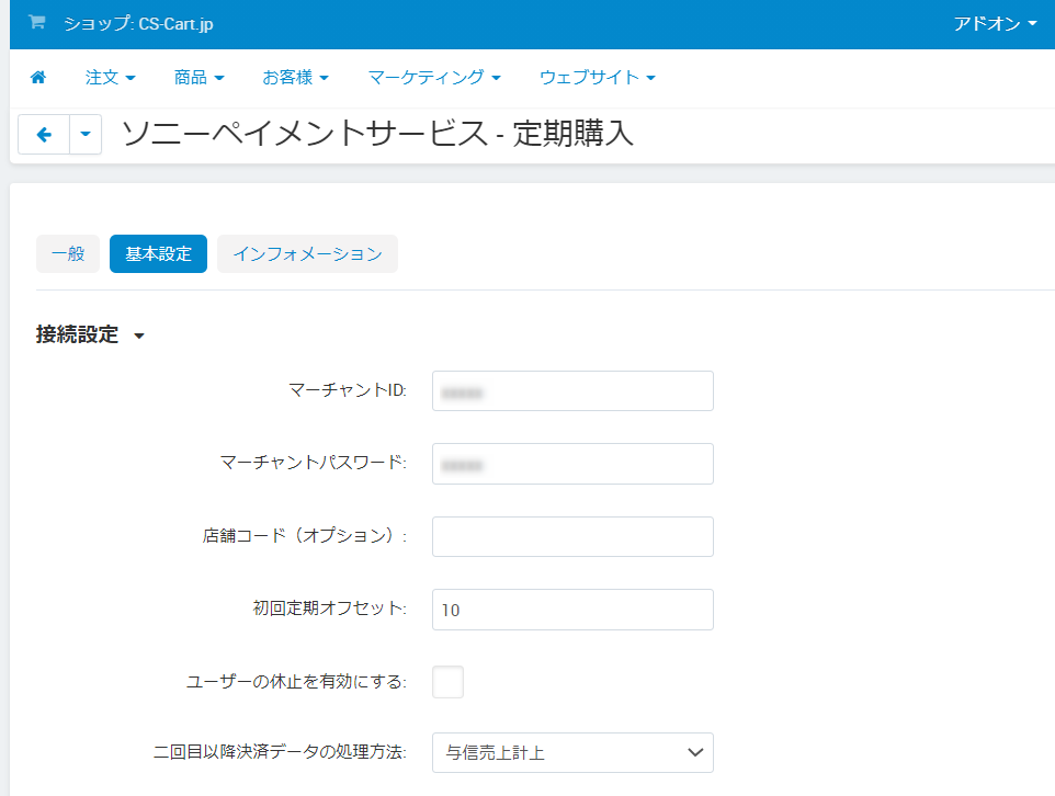 3. アドオン → アドオンの管理にある「ソニーペイメントサービス – 定期購入」の