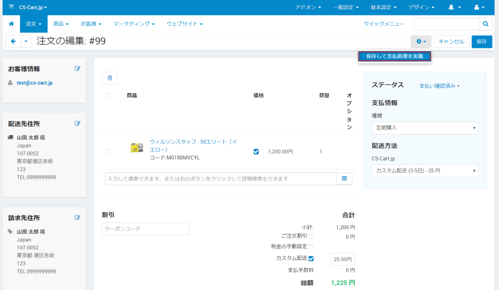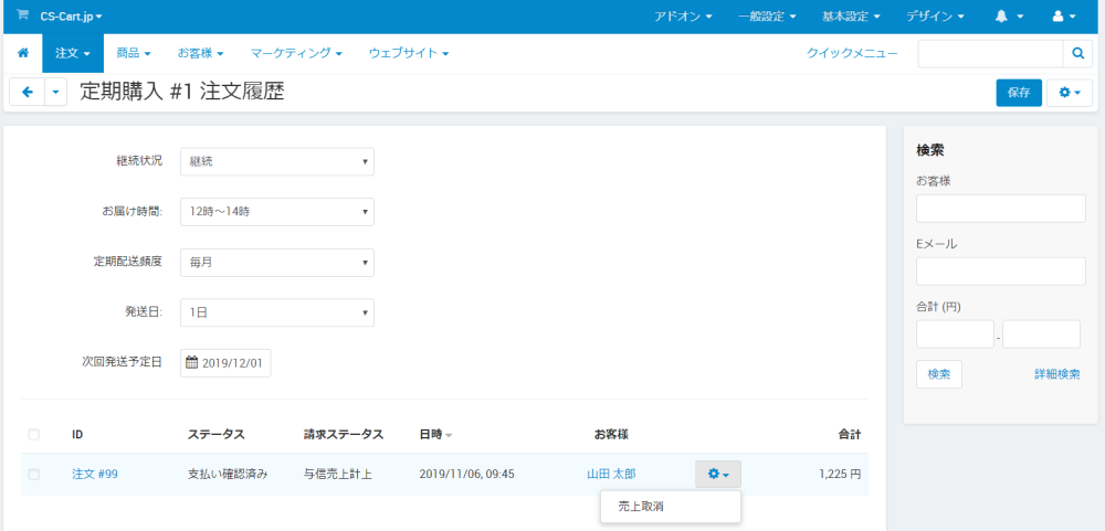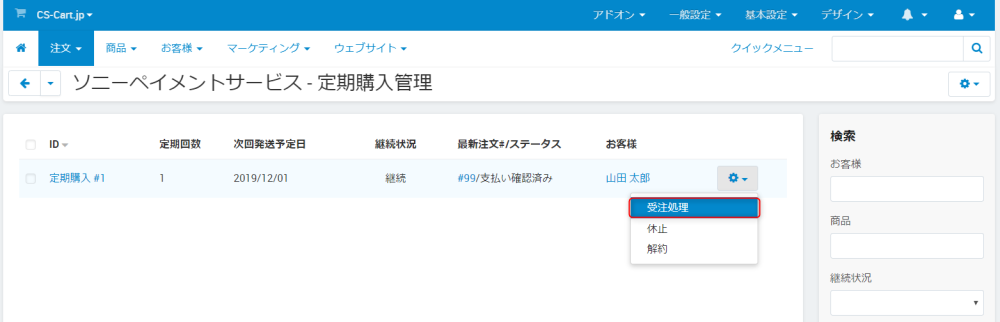 1. CS-Cart管理画面の注文 → ソニーペイメントサービス – 定期購入管理を開いてください。