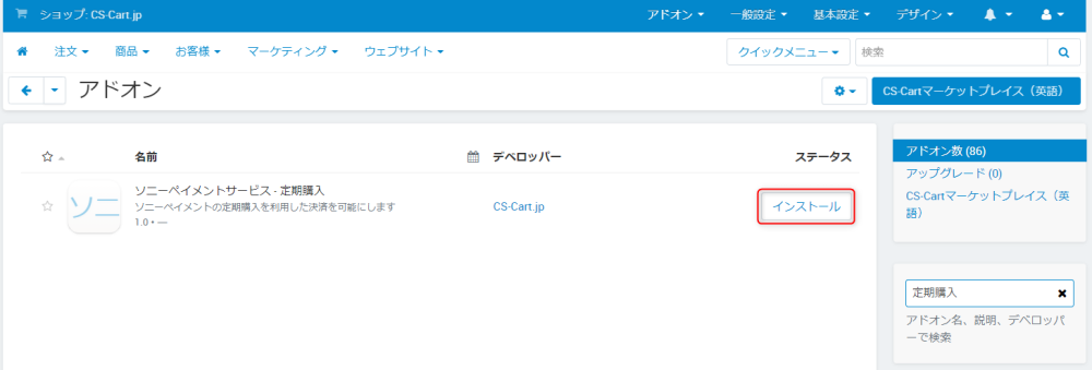 アドオン → アドオンの管理 にアクセスし、 ソニーペイメントサービス – 定期購入 をインストールします。