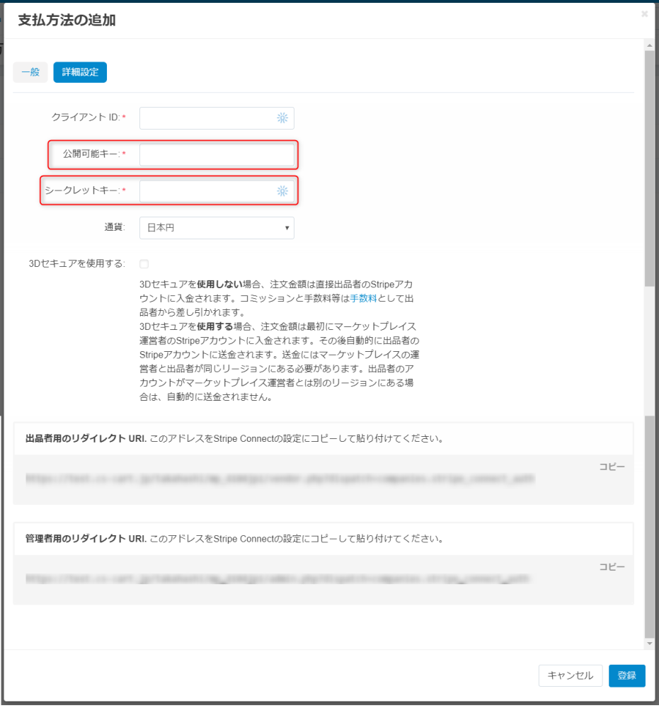 5.CS-Cart上でStripe Connect 決済の支払方法にある詳細設定の「出品者用のリダイレクト URI」と「管理者用のリダイレクト URI」をコピーし、
