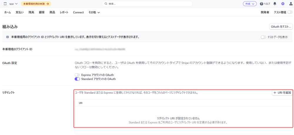 Stripe Connect 決済の支払方法を作成する際に、クライアント ID、公開可能キー、シークレットキーが必要です。また、リダイレクト URIs を Stripe に設定する必要があります。