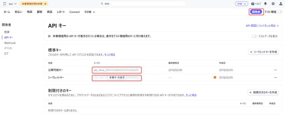 1.Stripe ダッシュボード右上の「開発者」をクリックし、サイドバーの「APIキー」を選択してください。
