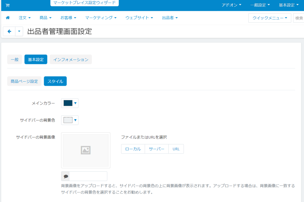 出品者管理画面の全体のスタイル(色、背景画像)を設定できます。