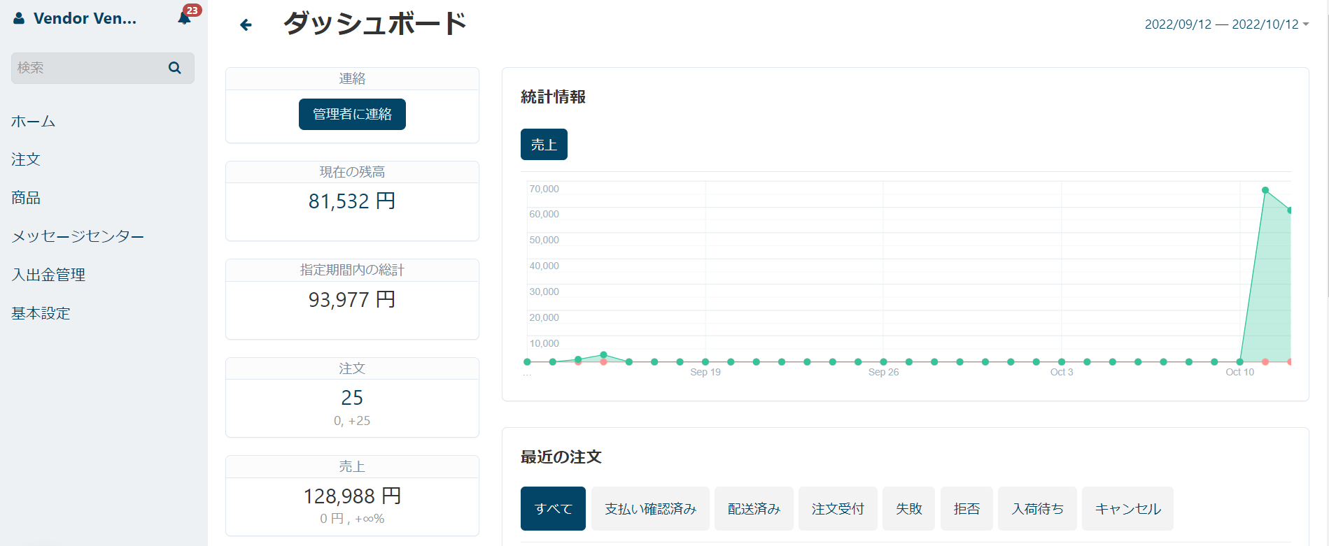 - 「出品者管理画面設定」リンクをクリックして設定画面を表示します。