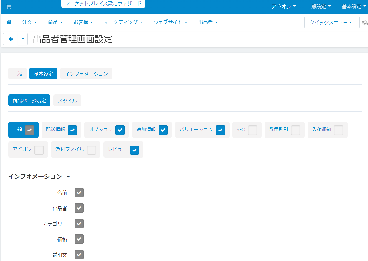 - アドオン → アドオンの管理 から「出品者管理画面設定」アドオンをインストールします。