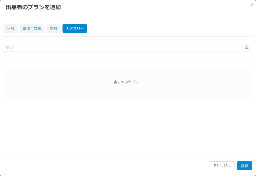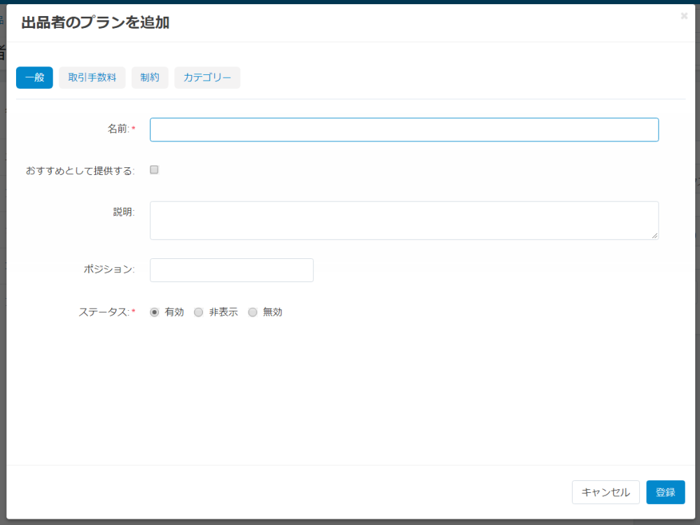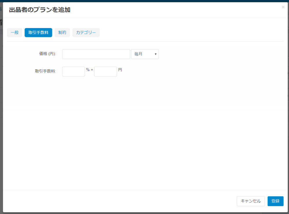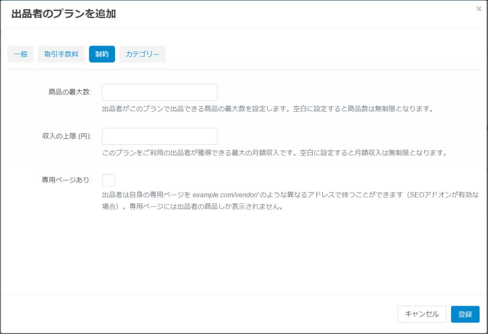 | 収入の上限 | このプランをご利用の出品者が獲得できる最大の月額収入です。空白に設定すると月額収入は無制限となります。 この上限を超えても出品者は通常運営可能です。どのように対応するかはショップの管理者次第です。 |