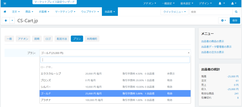 出品者 → 出品者 で出品者の詳細を開き、「プラン」タブを選択すると出品者のプランを変更できます。
