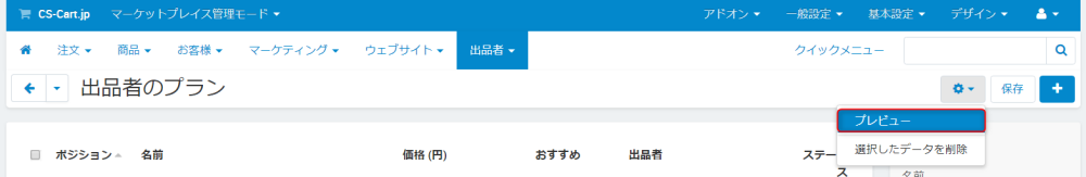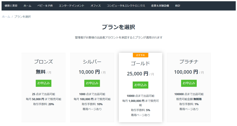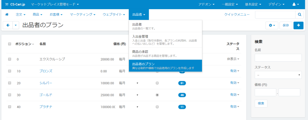 出品者 → 出品者のプラン にて出品者のプランを管理できます。