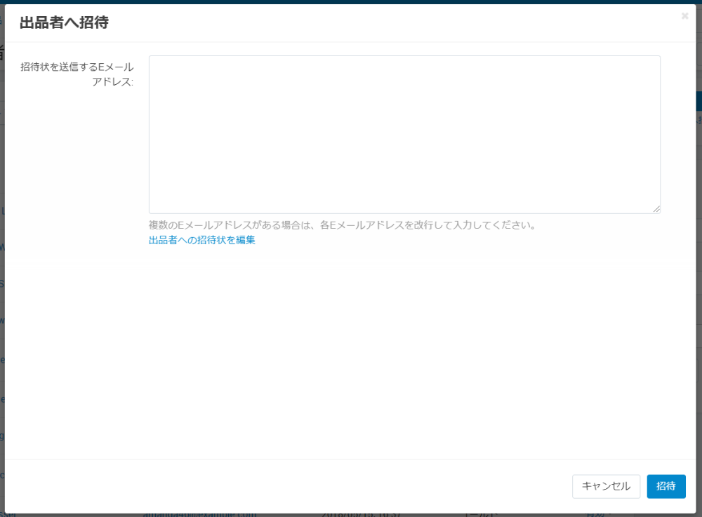 画面上部の「出品者へ招待」ボタンをクリックすると出品者へ招待画面が開きます。