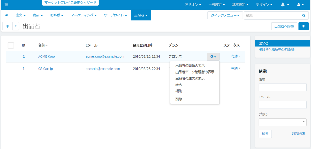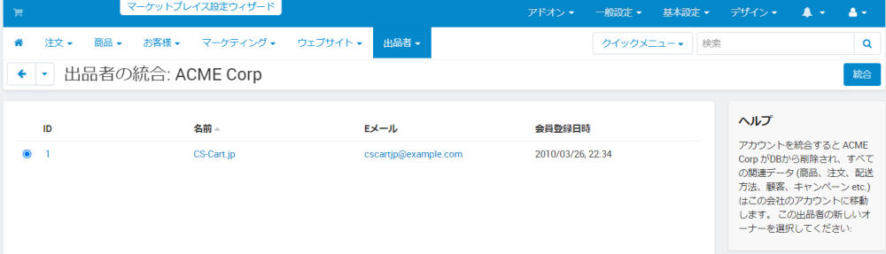 また、「統合」メニューを選択すると該当出品者のアカウントを削除して、他の出品者へ商品、注文、配送方法、顧客、キャンペーンなど)のデータを引き継ぐ事ができます。