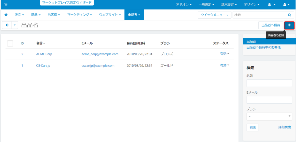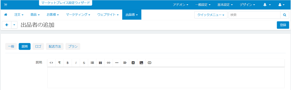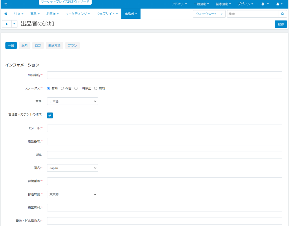 画面上部の「+」ボタンをクリックすると出品者の追加画面が開きます。