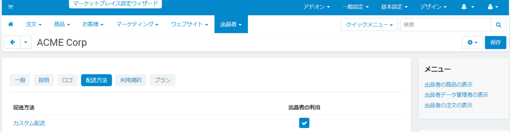 ※ こちらには 一般設定 → 配送方法/税金 → 配送方法 にて「出品者」にマーケットプレイスのデフォルト出品者が割り当てられた配送方法の一覧が表示されます。